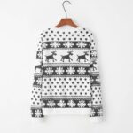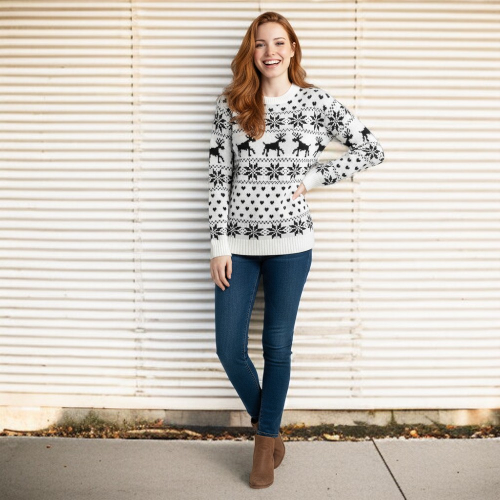 Notre pull de Noël femme blanc à motifs imprimés nordiques gris capture la beauté paisible des paysages enneigés et l’élégance intemporelle du style scandinave. Son design épuré unit la pureté du blanc à la finesse des motifs gris pour créer une harmonie visuelle apaisante.