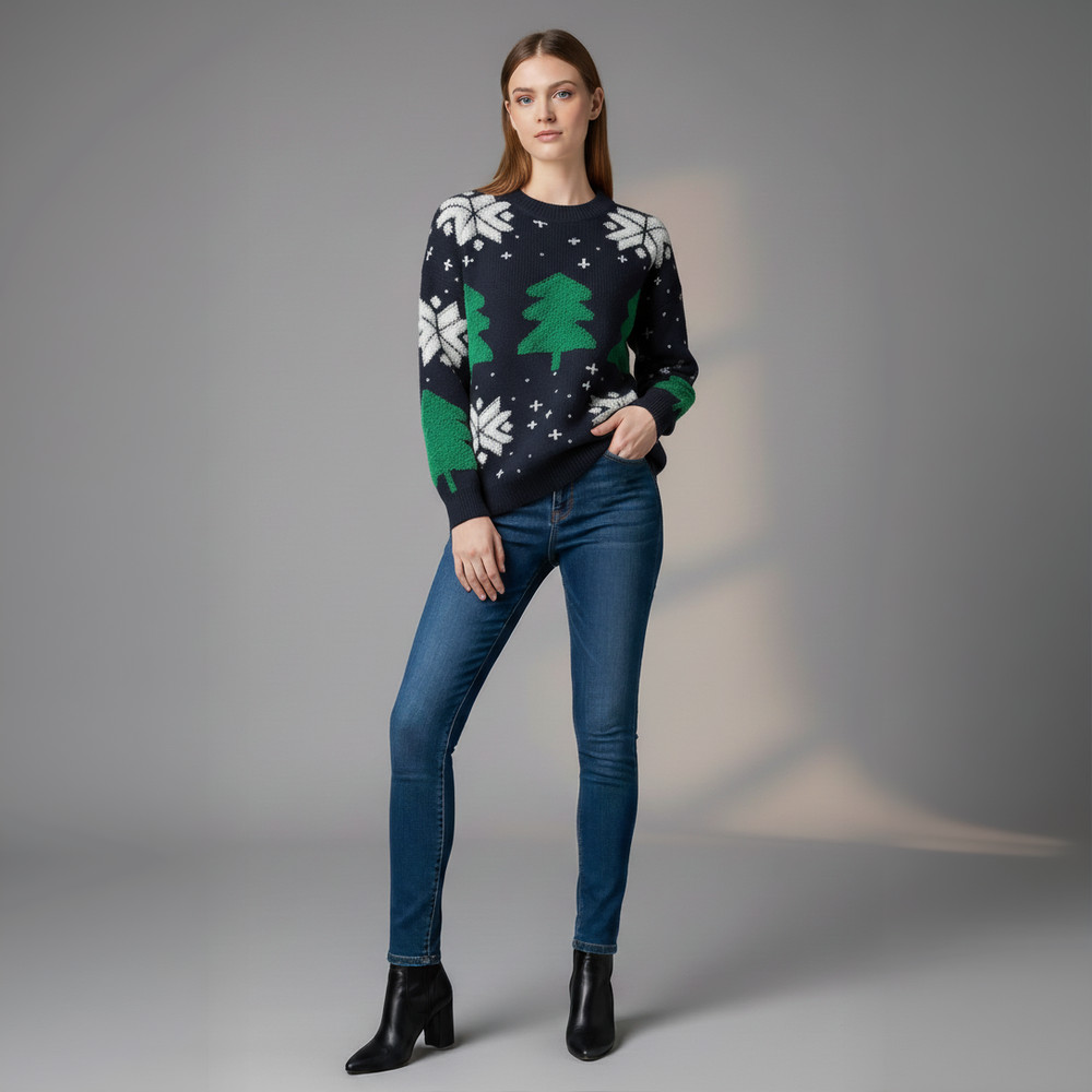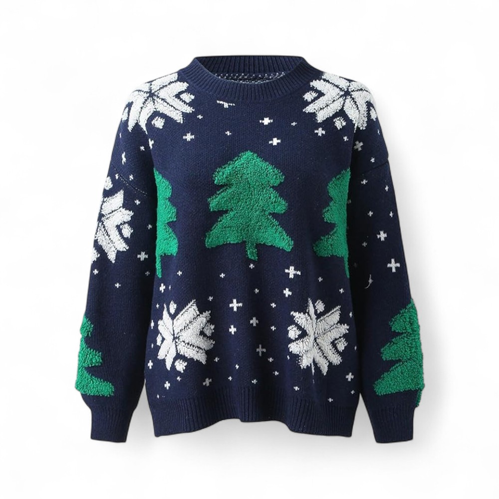 Son tricot épais, ponctué de sapins et de flocons délicats, évoque les soirées au coin du feu et les rires partagés en famille. Élégant sans être trop sage, il mêle chaleur, douceur et magie, pour vivre pleinement l’esprit de Noël.