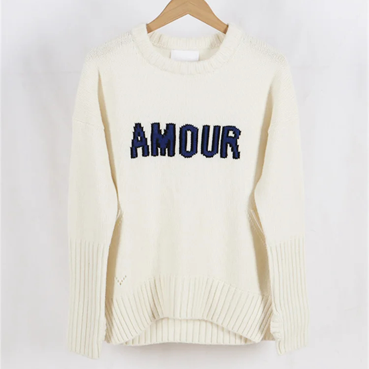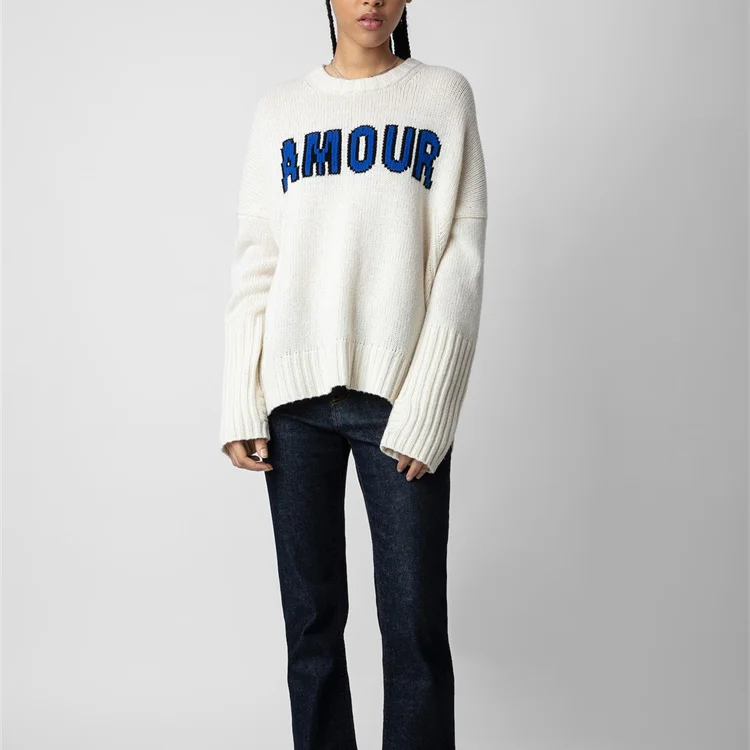Ce magnifique pull en cachemire pour femme est le parfait mélange de confort et de style. Le design du pull est simple et épuré, avec un col rond classique et une inscription "amour" brodée en lettres délicates, bleues, sur le devant. Cette touche romantique ajoute une note de tendresse et de féminité à ce vêtement déjà luxueux.