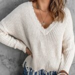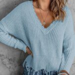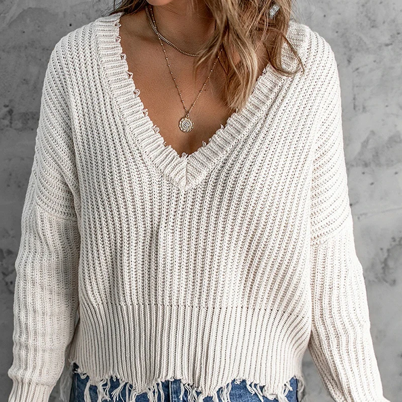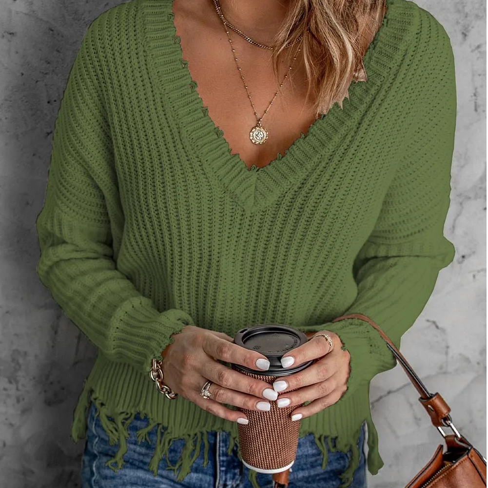 Ce pull col V femme à franges est un produit de qualité conçu pour les femmes qui veulent être belles et sexy même par temps froid. Un joli décolleté en V et des petites franges en bas du pull, tout ceci en huit couleurs et cinq tailles à choisir pour vous faire plaisir.