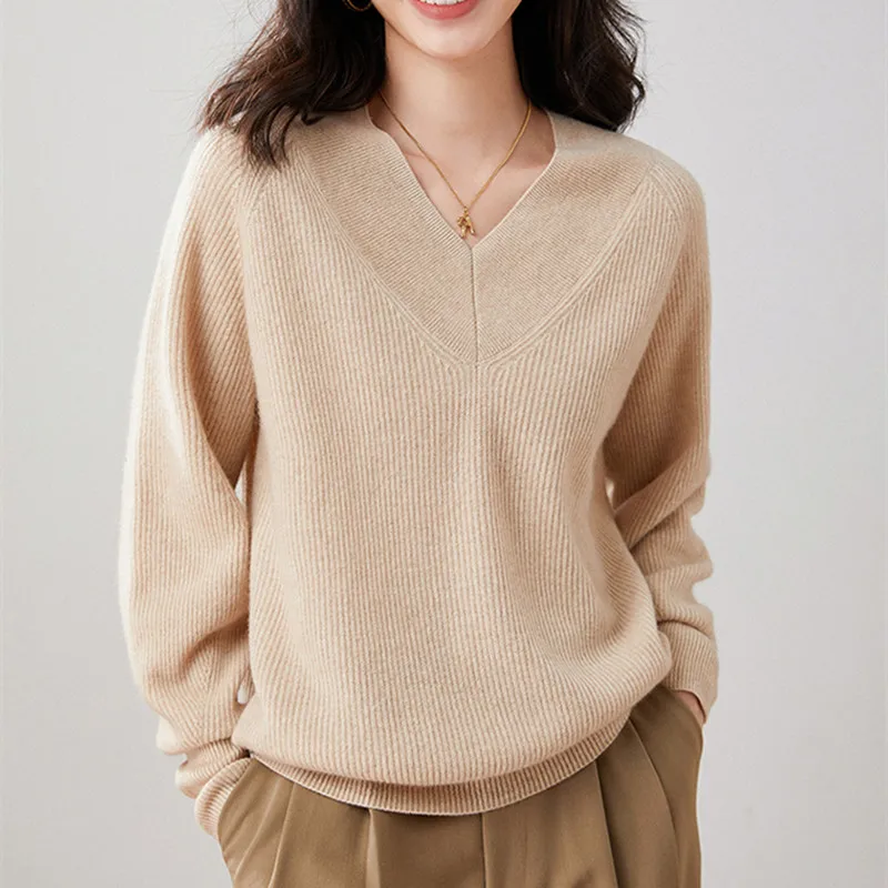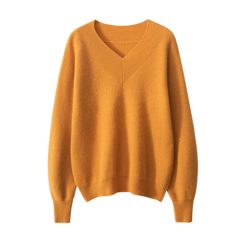Notre pull col V femme pur cachemire est conçu pour être porté plutôt à l'automne et au printemps. Il est doté d'une encolure en V avec un très large bord côtes de la même largeur que le bord côte du bas des manches. Les manches raglan sont finement raccordées au pull et apportent une très grande élégance tout autant que le travail sur les manches.