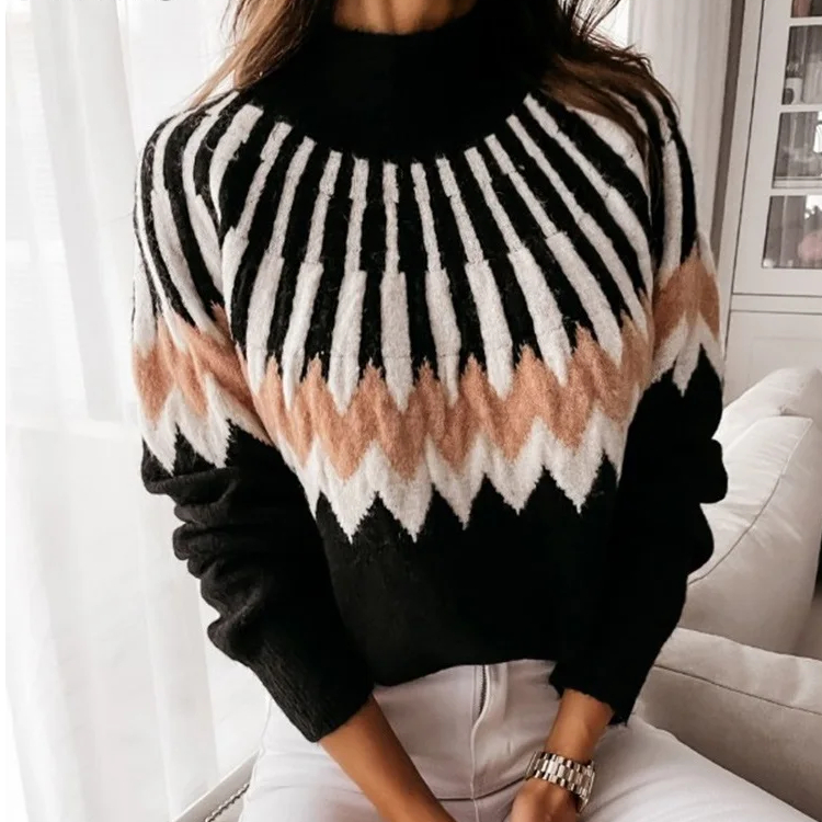Son motif jacquard lui confère une allure chic et intemporelle, parfait pour ajouter une touche de sophistication à votre tenue. Le col cheminé apporte une touche moderne et originale à ce pull, tout en vous protégeant du froid et en vous donnant une allure élégante. Ce pull est idéal pour les journées fraîches où vous souhaitez rester confortable sans sacrifier votre style.