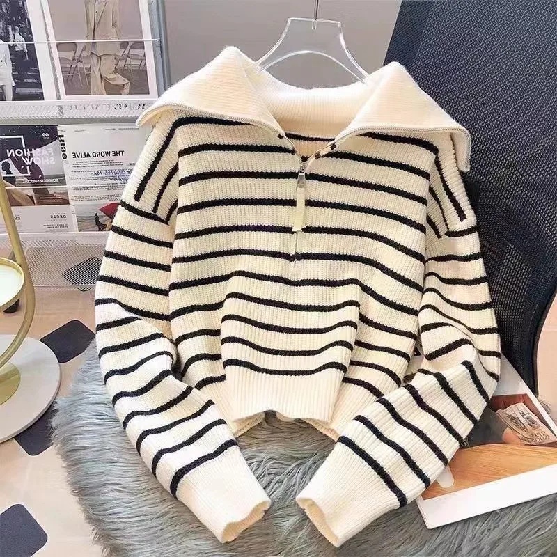 Plongez dans un style marin empreint d'élégance et de modernité avec notre pull marin rayé à col zippé pour femme, disponible en noir ou en beige à rayures. Conçu pour être votre allié de choix lors des journées de mi-saison, notre pull offre un équilibre parfait entre confort et allure sophistiquée.