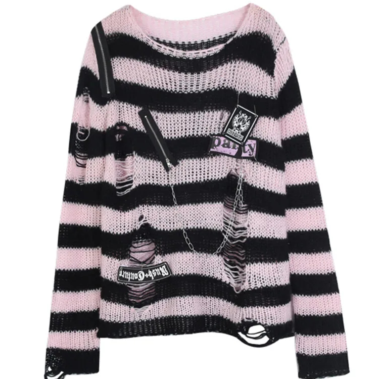 Notre pull rock and roll femme rayé à trous est orné de chaînes, de fermetures éclair, de petites broches et breloques qui lui donnent un look un peu gothique : les deux styles se mêlent sans se déranger ce qui fait un joli mélange. La longueur du pull convient tout à fait à cette allure décontractée et nonchalante. Il est facile à accorder à tous styles de pantalons ou jeans.