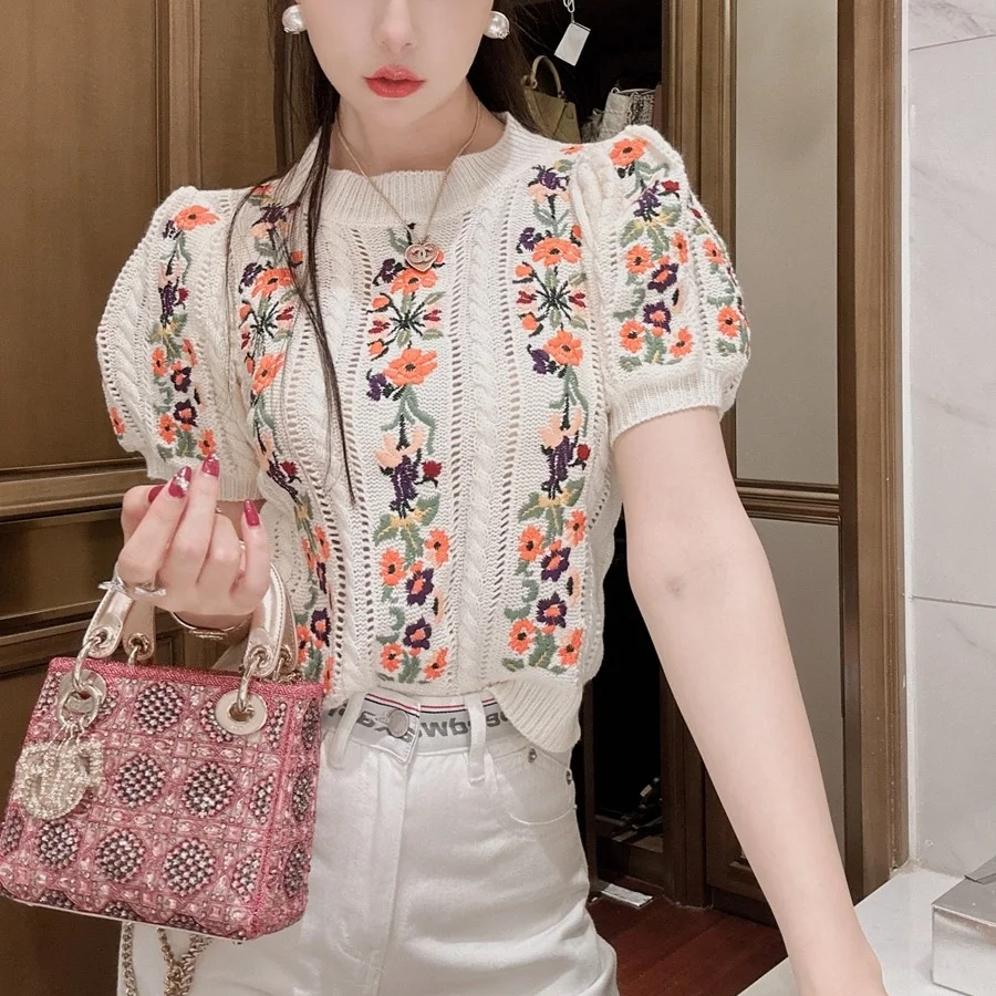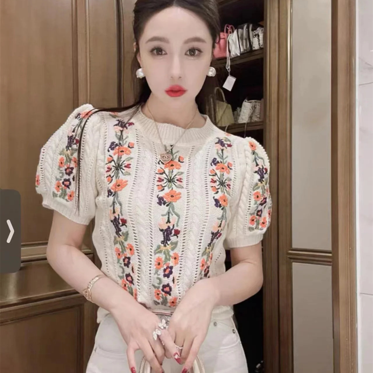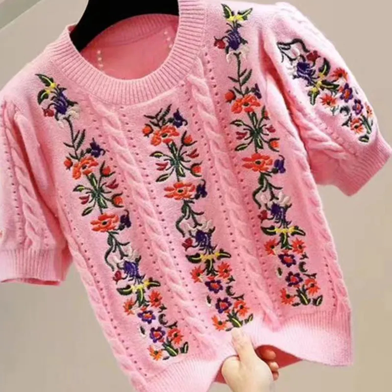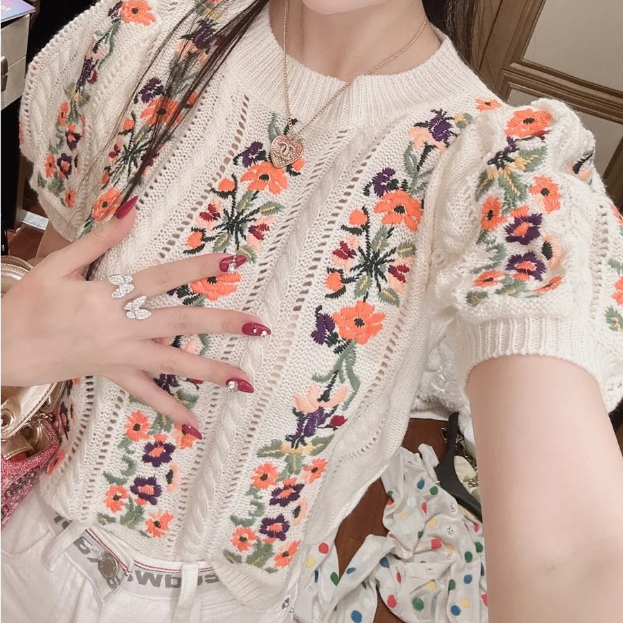 Ce pull vintage femme brodé est un pull de qualité conçu pour l’été avec des broderies fraîches et fines qui lui apportent une allure romantique. Son look rétro chic est accentué par les finitions de qualité et la coupe assez courte de ce pull. Proposé en taille unique, il existe en deux couleurs.