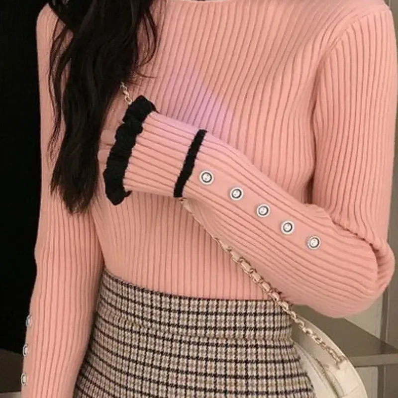 Ce pull vintage femme côtelé est un produit conçu pour la mi-saison à col montant et manches longues : tous les bords sont dentelés, de couleur différente du pull avec un liseré de même couleur avant les côtes. Ces ornements tricotés avec beaucoup de soin apportent de l'élégance à ce pull simple au demeurant. L'allure en devient élégante et romantique.
