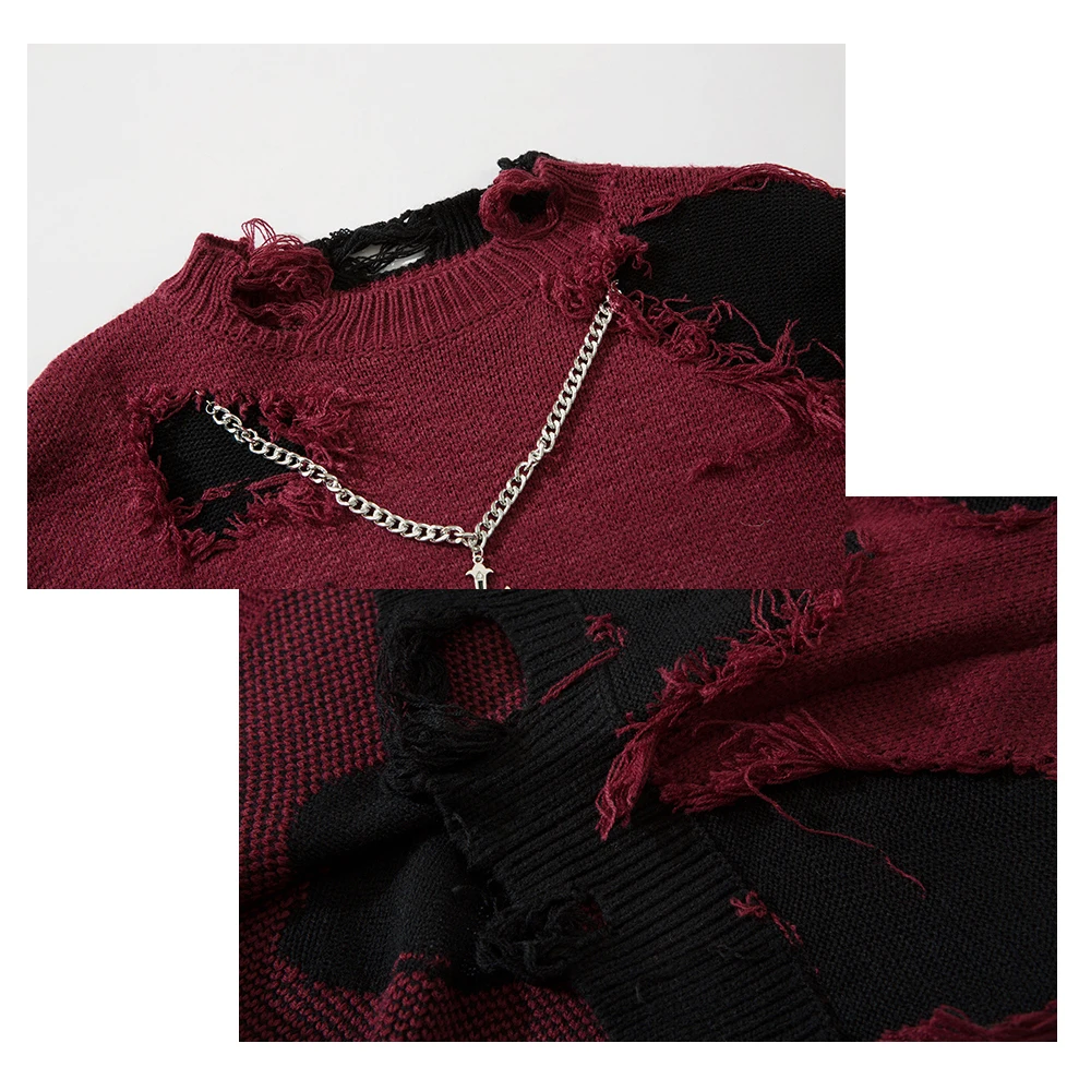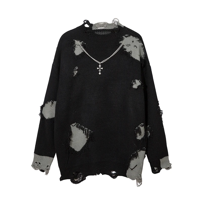 Notre pull rock and roll homme avec chaîne et croix est tricoté en deux couleurs pour accentuer l'endroit des déchirures et appuyer encore un peu plus le look rock'n'roll. Les croix sur les chaînes apportent un côté plutôt gothique qui s'allie au rock pour un résultat très tendance et streetwear. On obtient un pull polyvalent qui convient à beaucoup de personnes.